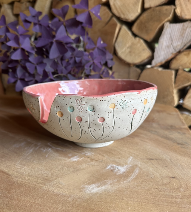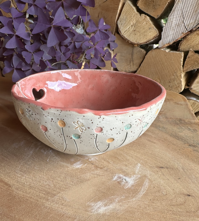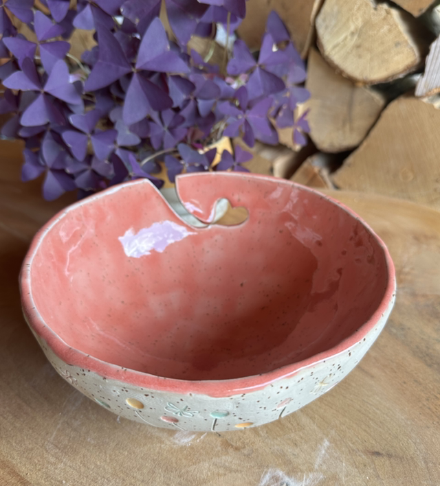 Sie hat eine kleine Aussparung für den Faden. Dieser wird sicher durch das kleine Herz geführt. Das Knäul Wolle liegt in der Schale und kann somit nicht mehr wegrollen.