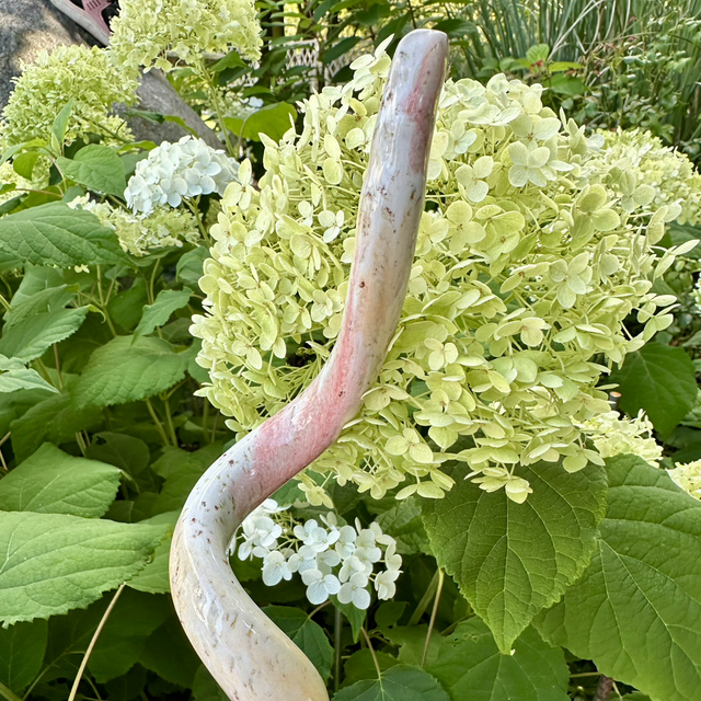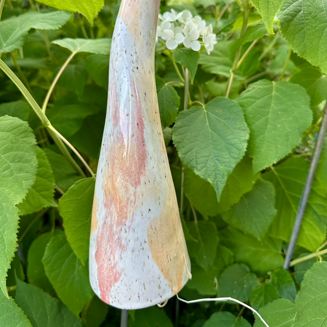 Liebevoll von Hand getöpfert mit einer creme-weißen Glasur versehen über die die Farben rosa und orange verlaufen. Forstfest gebrannt.
