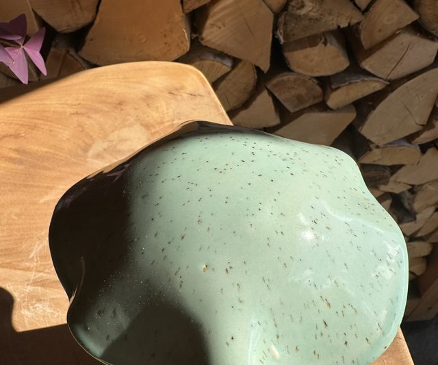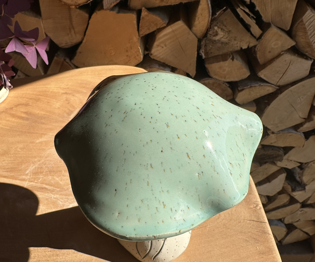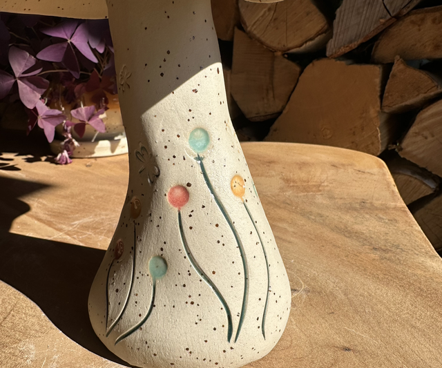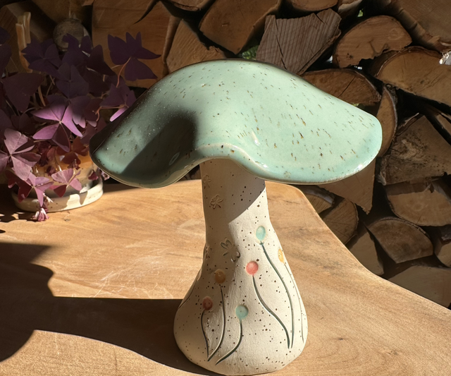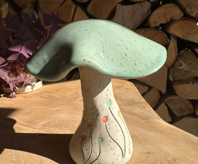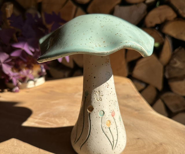 Dieser handgemachte Keramik-Pilz ist ein einzigartiges Wohnaccessoire für alle, die Natur, Boho- und Cottagecore-Deko lieben. Der sanft mintgrüne Schirm und das verspielte Blumenmuster am Stiel machen ihn zu einem echten Blickfang.