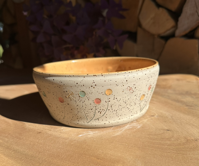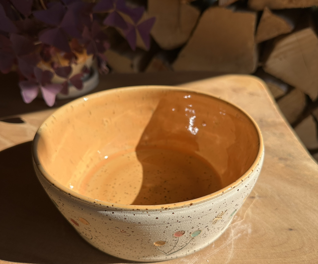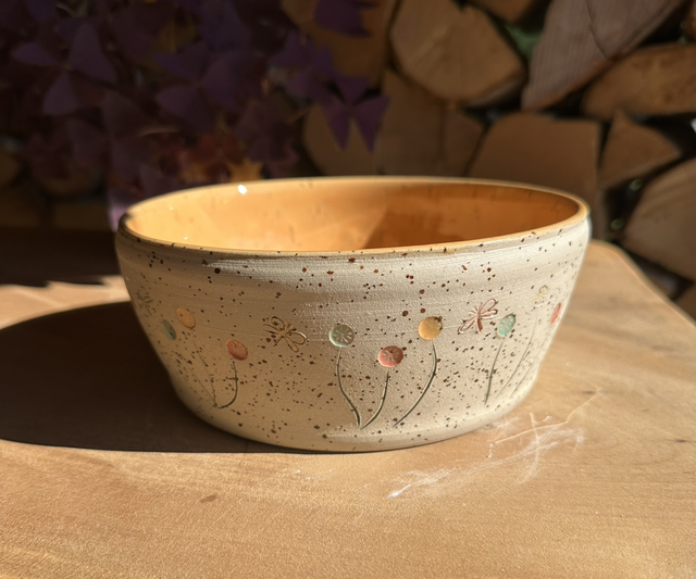 Diese handgemachte Keramikschale ist ein echtes Unikat: Außen naturbelassen mit floralem Muster, innen mit einer kräftigen orangen Glasur versehen.