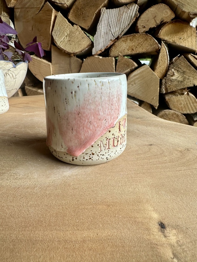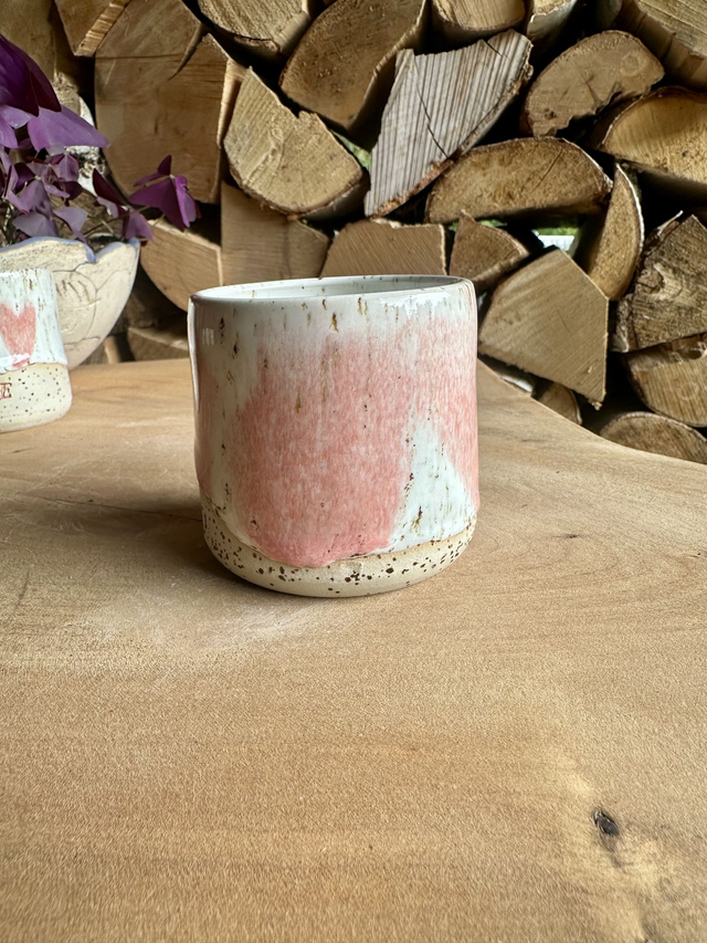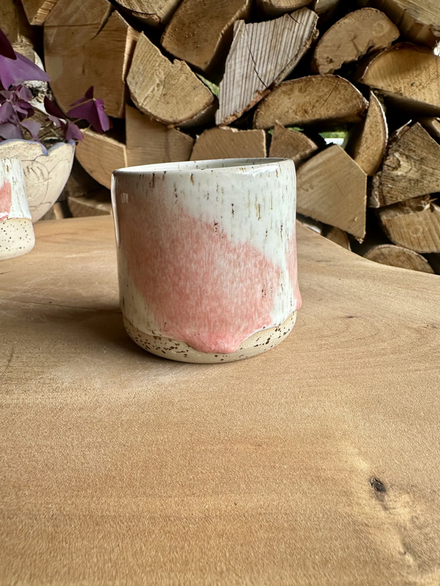 Die sanfte Glasur in zarten RosĂŠ- und CremetĂśnen verleiht dem Becher eine warme, natĂźrliche Ausstrahlung. Durch die feinen Sprenkel und die handgearbeitete Form wird jedes StĂźck zu einem echten Unikat.