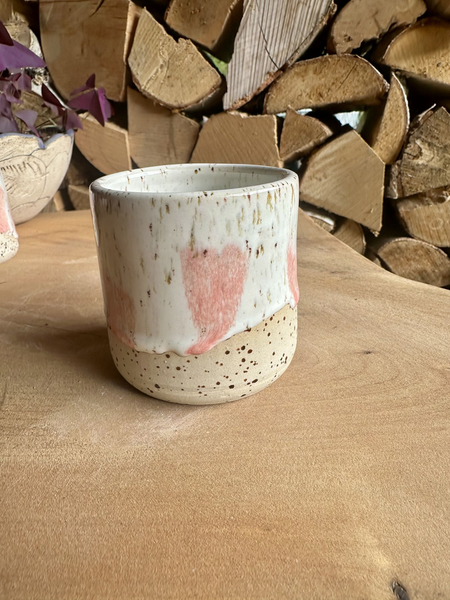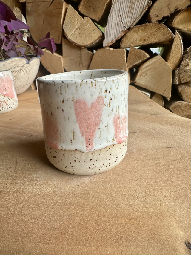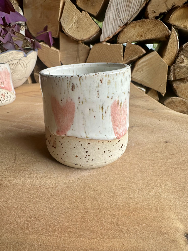 Die zarte Glasur in Rosé- und Cremetönen und die handgemalten Herzdetails machen jeden Becher zu einem echten Unikat – warm, liebevoll und perfekt für jeden Tag.