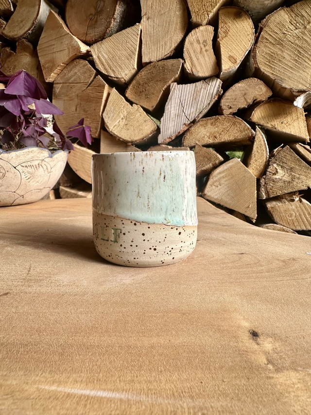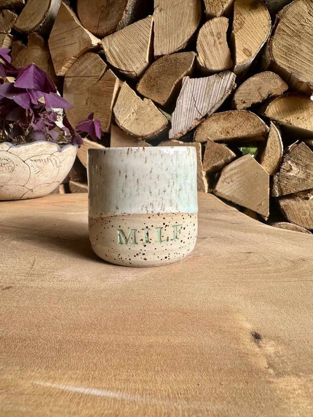 Dieser handgefertigte Keramikbecher mit der Gravur „MILF“ verbindet Humor, Stil und hochwertige Handarbeit. Die sanfte Glasur in Mint- und Cremetönen macht jedes Stück zu einem echten Unikat. Perfekt für alle, die Humor lieben – aber mit Geschmack.