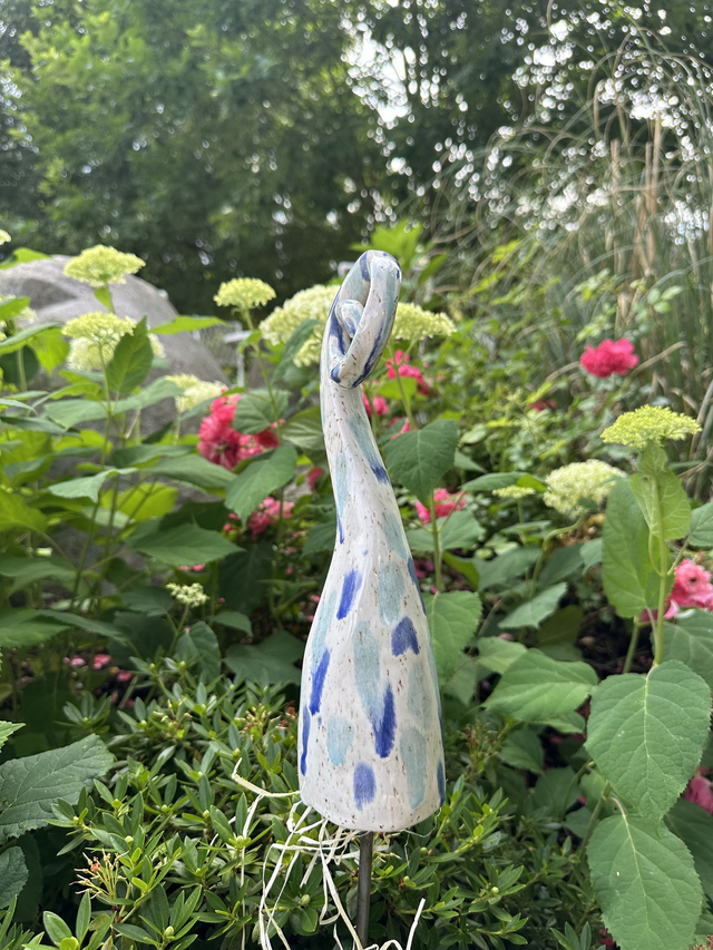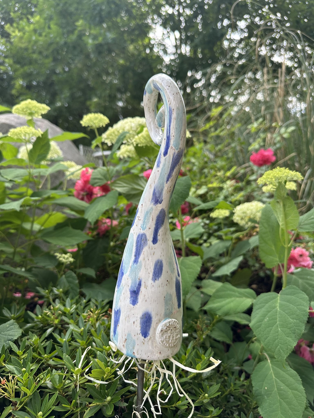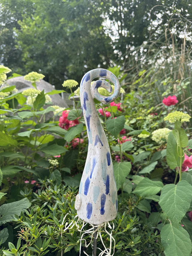 Liebevoll von Hand getöpfert und mit einer weißen Glasur mit hell und dunkel Blauen verlaufenen Punkten verstehen. Forstfest gebrannt.