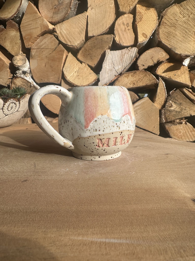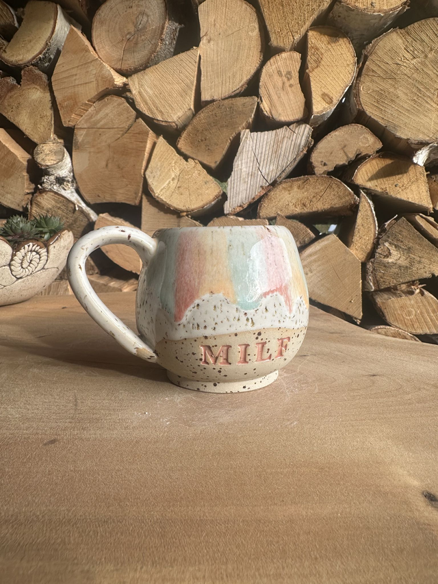 Ein handgetöpferter Becher mit Augenzwinkern. Der Keramikbecher „MILF“ vereint Natürlichkeit, Farbe und Humor.