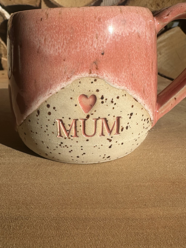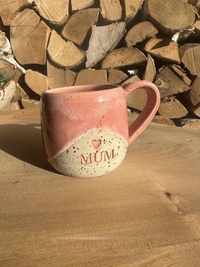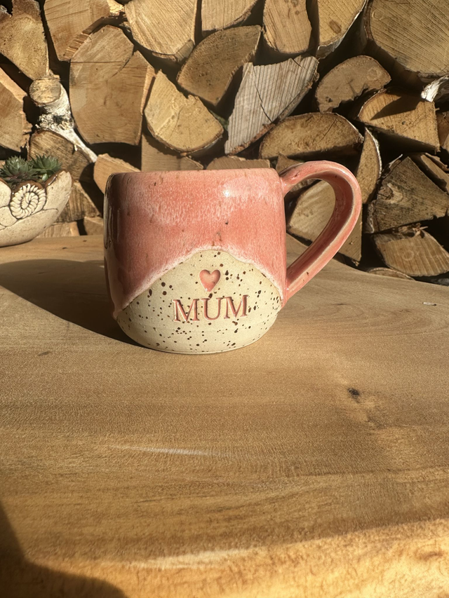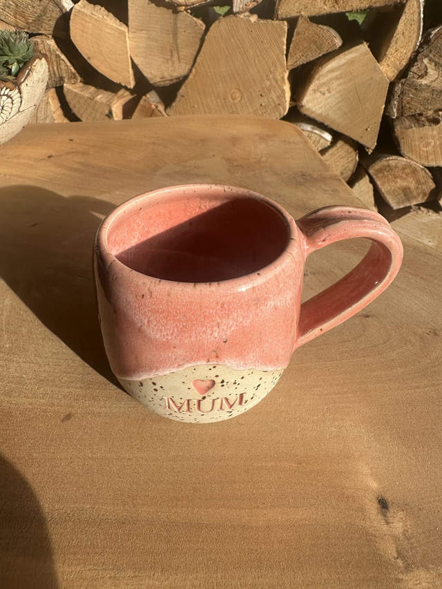 Keramikbecher „MUM“ mit Herz – handgemacht & rosa glasiert