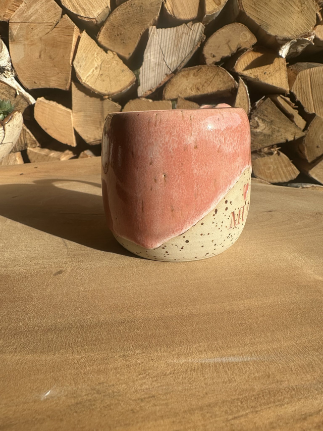 Mit seiner rosa Glasur, der zarten Herzprägung und der natürlichen Struktur ist jeder Becher ein Unikat – liebevoll gefertigt, robust & wunderschön.