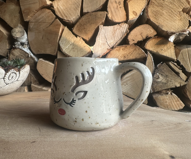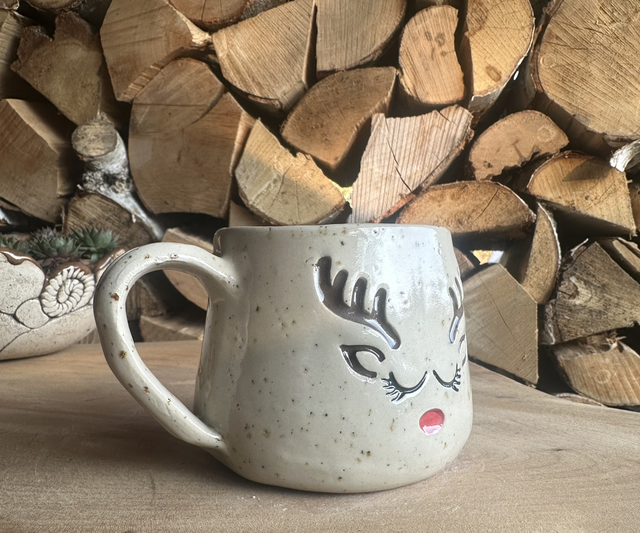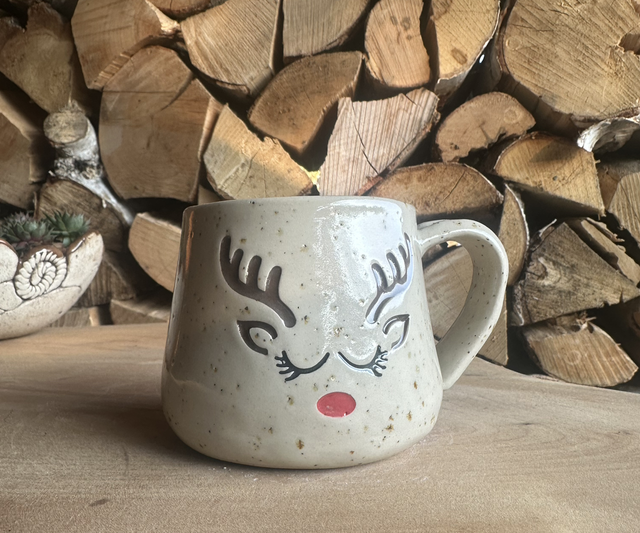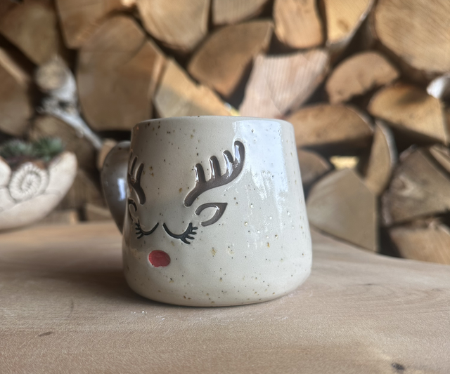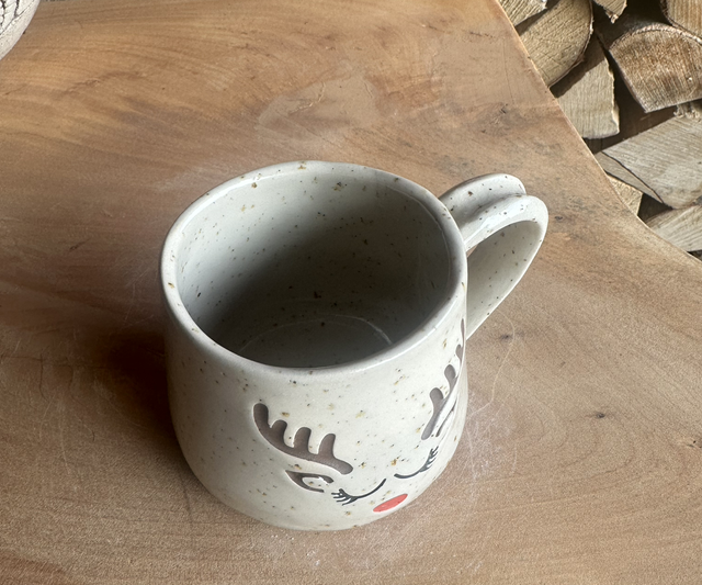 Diese liebevoll bemalte Rentier-Tasse aus Keramik bringt festliche Freude in jede Küche.