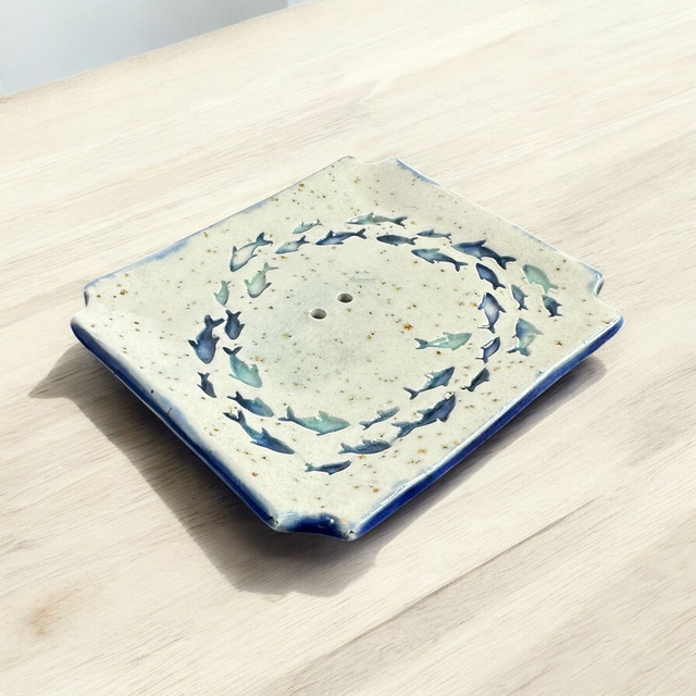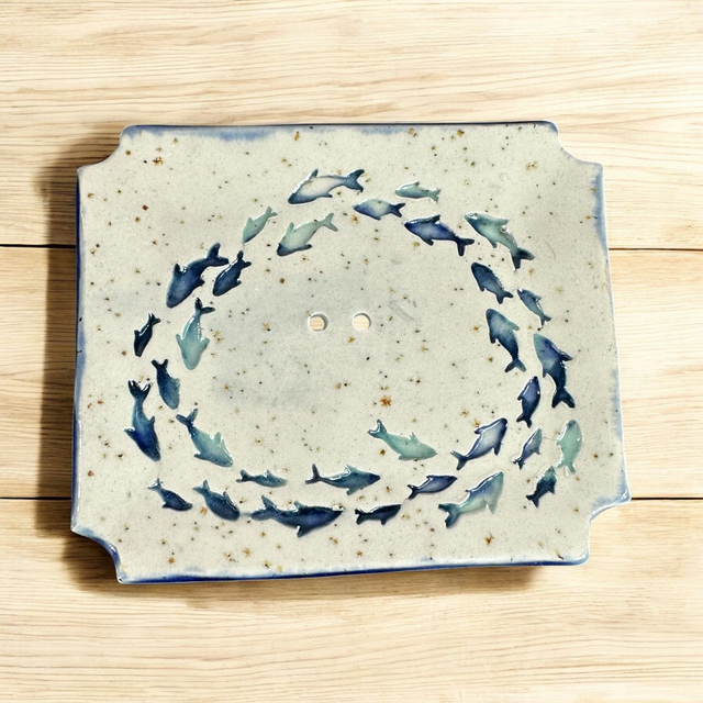 Wunderschöner Seifenteller, mit dem Abdruck von einem kreisenden Fischschwarm. Verziert habe ich die Seifenschale mit verschiedenen Blautönen. Die Seifenschale ist komplett mit kleinen braunen Sprenkeln überzogen und mit einer glatten transparenten Glasur glasiert worden.
