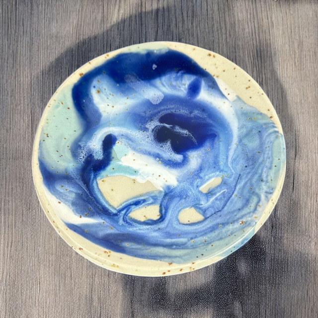 Kleiner Teller aus Keramik, handgefertigt und glasiert. Die Glasur ist transparent mit kleinen braunen Sprenkeln und einem einzigartigen Farbverlauf von hell- und dunkelblau.