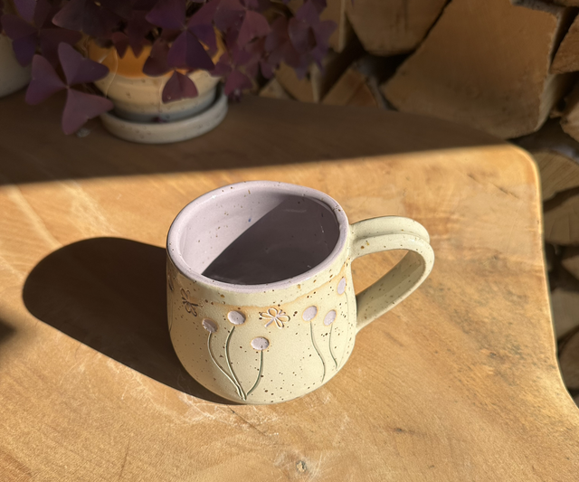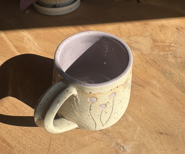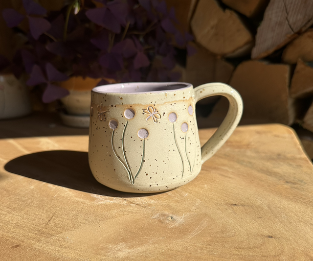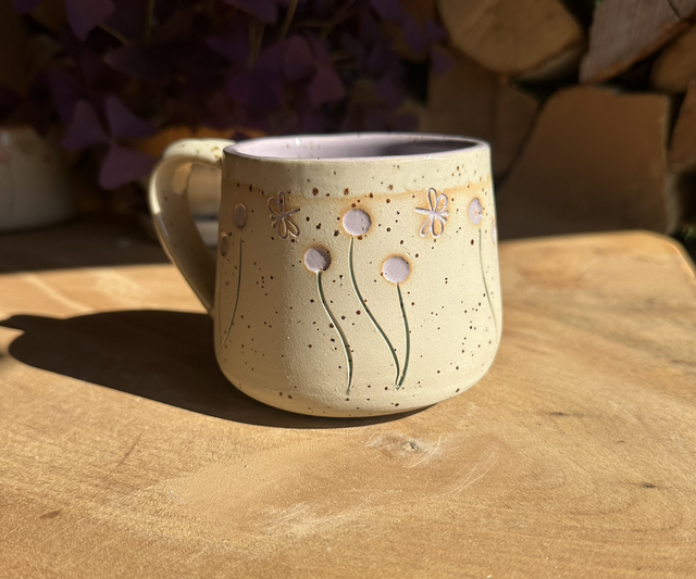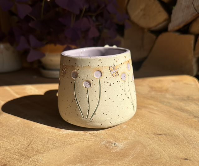 Handgetöpferte Tasse im Pünktchen-design mit Blumen in zartem Lila