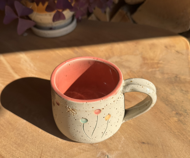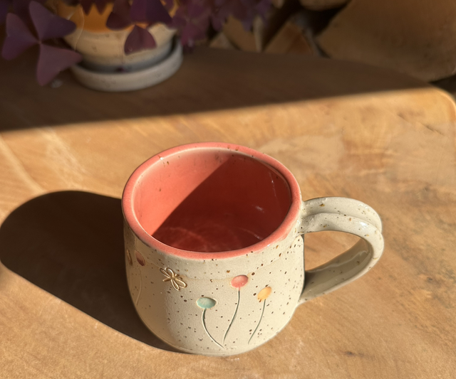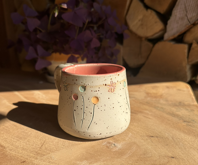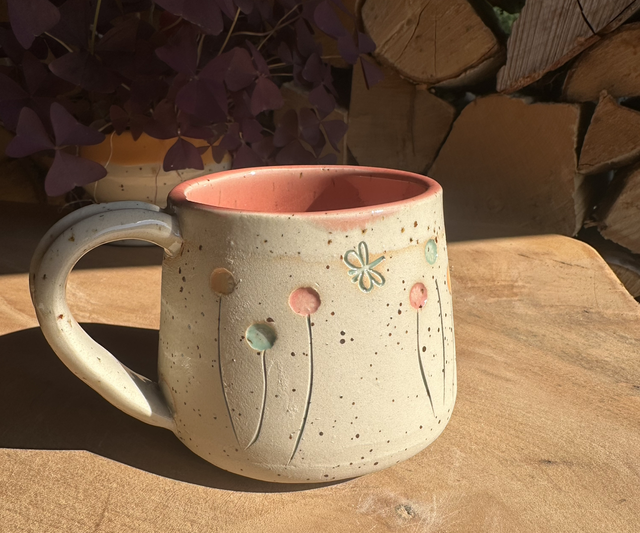 Handgetöpferte Tasse im Pünktchen-design mit bunten Blumen (orange, türkis und rosa)