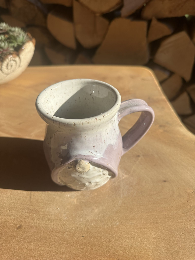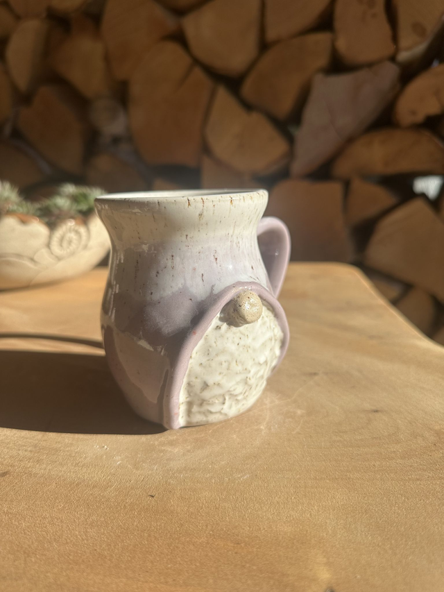 Diese zarte Wichteltasse wurde liebevoll modelliert und in sanftem Flieder glasiert.